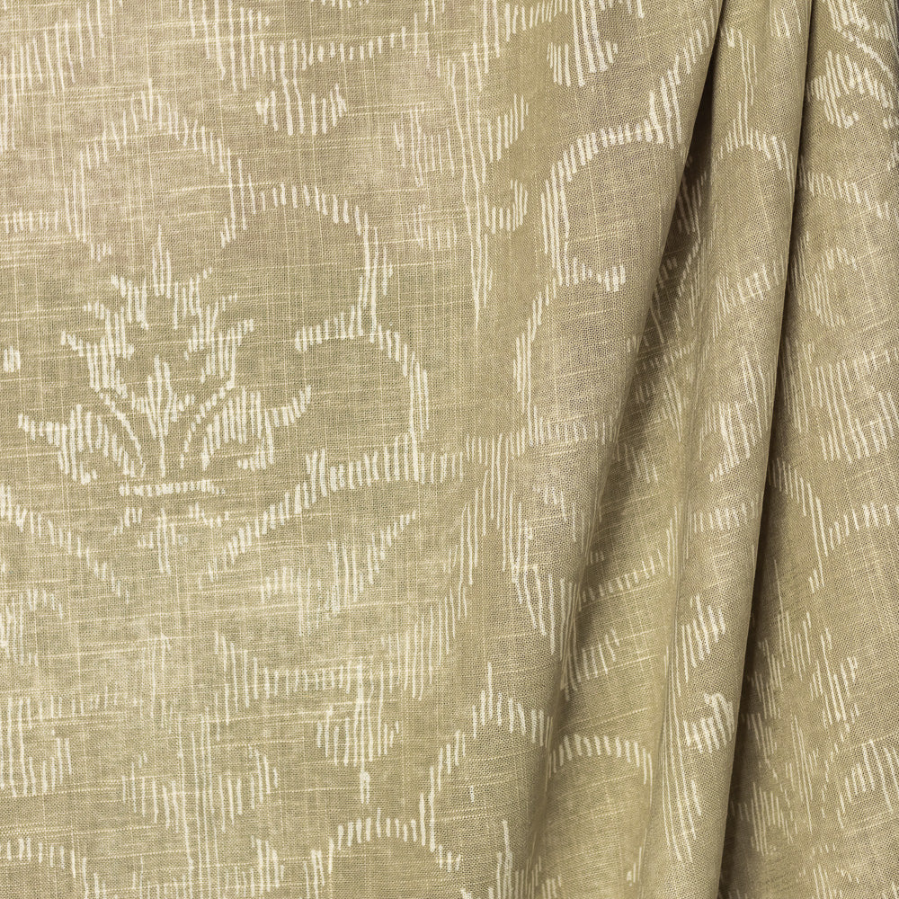 The Penelope print is a traditional pattern with simple vertical lines forming the shapes. Penelope Pebble is a light, natural-toned background with the print contrasting in white; the background has the slightest green undertone. This fabric would be suitable for curtaining, blinds, cushions, and occasional upholstery.