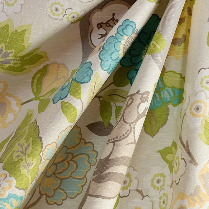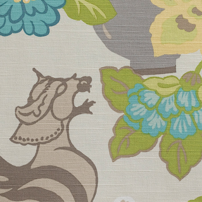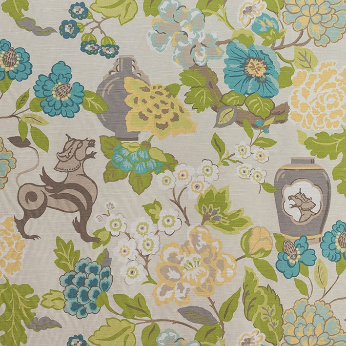 Statuesque dogs and vases sit amongst gorgeous blue and yellow florals in this eclectic print.