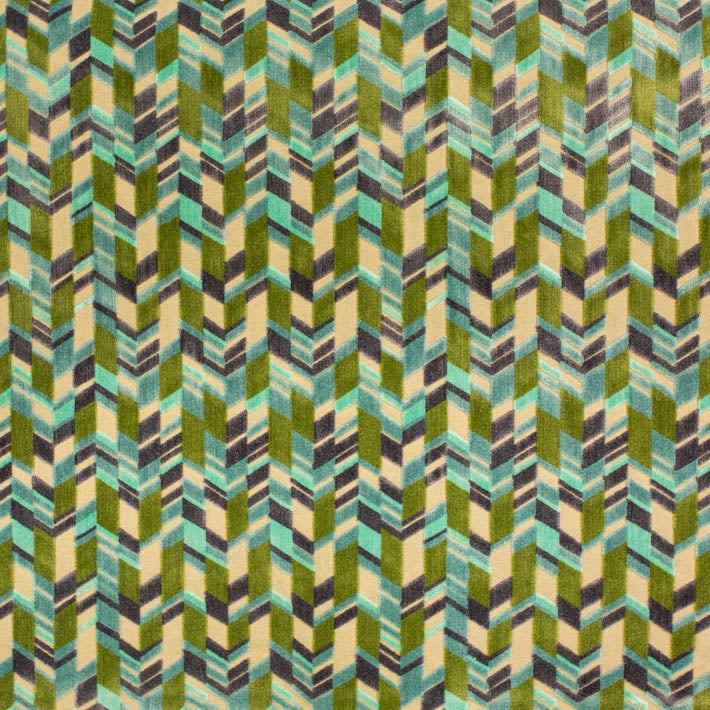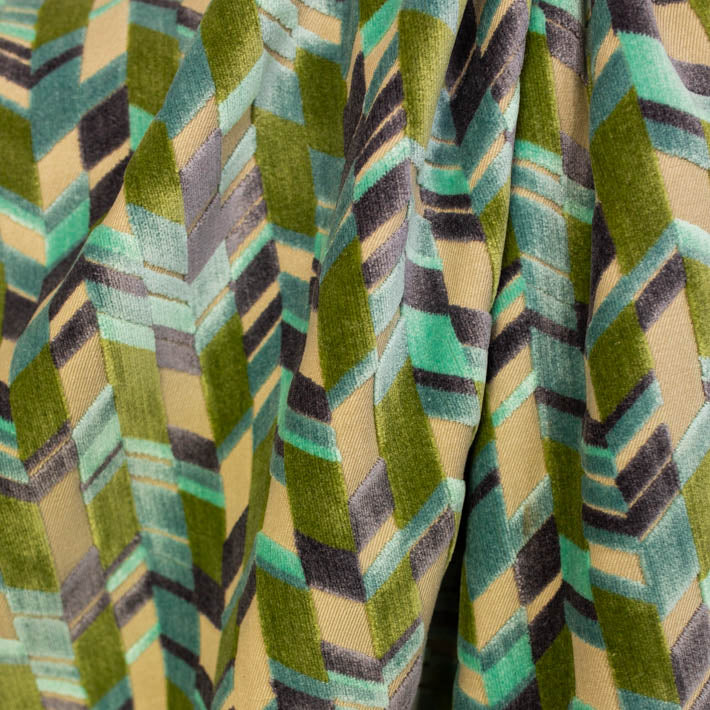 Sulley is a stunning textured and vibrant velvet with a modern colourful geometric design.  This fabric is a lovely conceptual three-dimensional take on a chevron zig zag pattern in a lovely array fo blues and greens. A sure fire way to add a pop of colour and texture to your home, or better yet style your room around this amazing fabric. Suitable for statement curtains, heavy use upholstery, cushions and other home accessories.