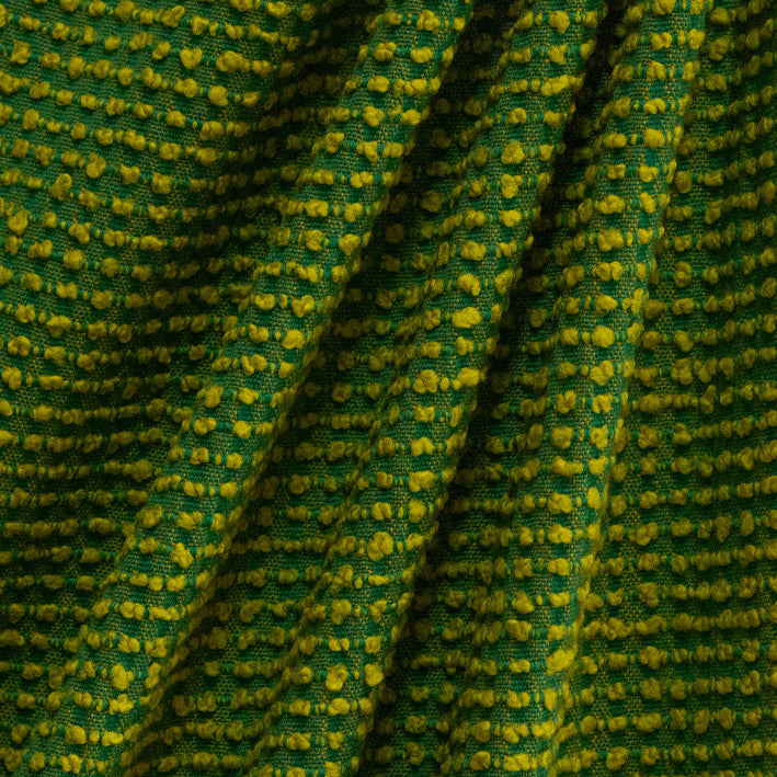 Add colour and texture with Tutti Studio Tingle Green Wool Boucle Fabric, a bold furnishing fabric spun for flair and function. With an Emerald green wool base and cheerful yellow and Citron boucle yarns, this textile is a joyful nod to vintage design with a fresh, playful twist. It’s perfect for blinds, cushions, or modern upholstery work.