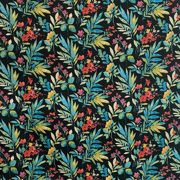 A beautiful watercolour style floral print on a black background with wonderful splashes of turquoise, red, gold and green. Fantastic for statement curtaining, cushions, and occasional upholstery.