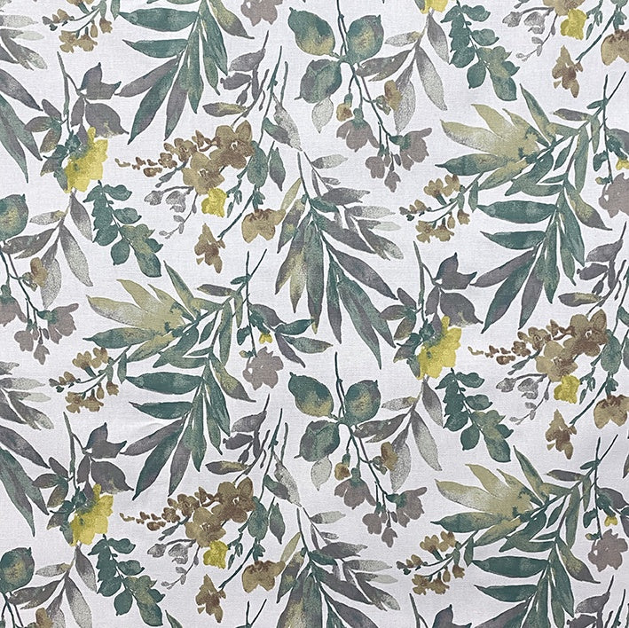 A beautiful watercolour style floral print in turquoise and neutrals with a splash of chartreuse, printed on a 100% cotton basecloth. Fantastic for curtaining, cushions and occasional upholstery.