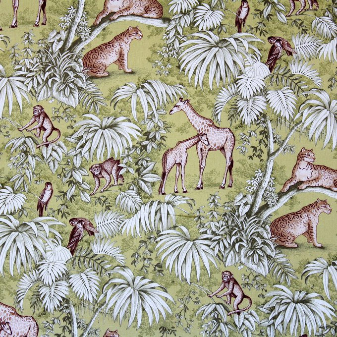 A fun, safari themed, animal print fabric on a lovely sage green base cloth! Perfect for curtaining, cushions and accessories.