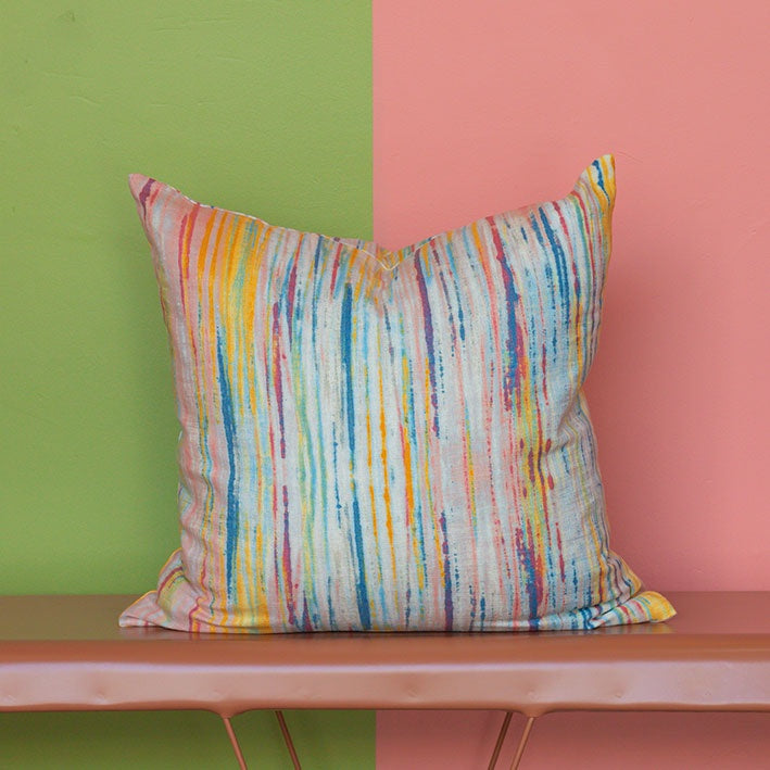 This colorful and fun premade cushion outer is sure to brighten up a room! The fabric is a multicolored printed linen/viscose that features stripes through a painterly style. This cushion would be the perfect size and statement for bedding, couch cushions, or any other spot that could use some color.