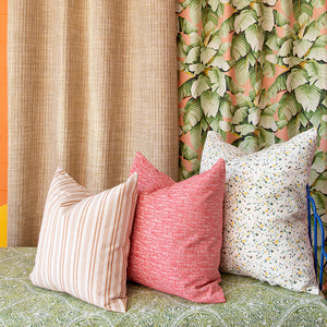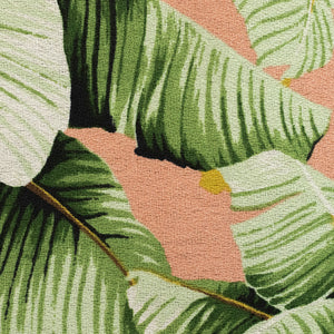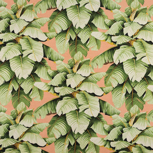 Paradise calls with tropical lush green banana leaves layering playfully over a peach pink backdrop. Perfect for everyday upholstery, occasional upholstery, curtaining and cushions.