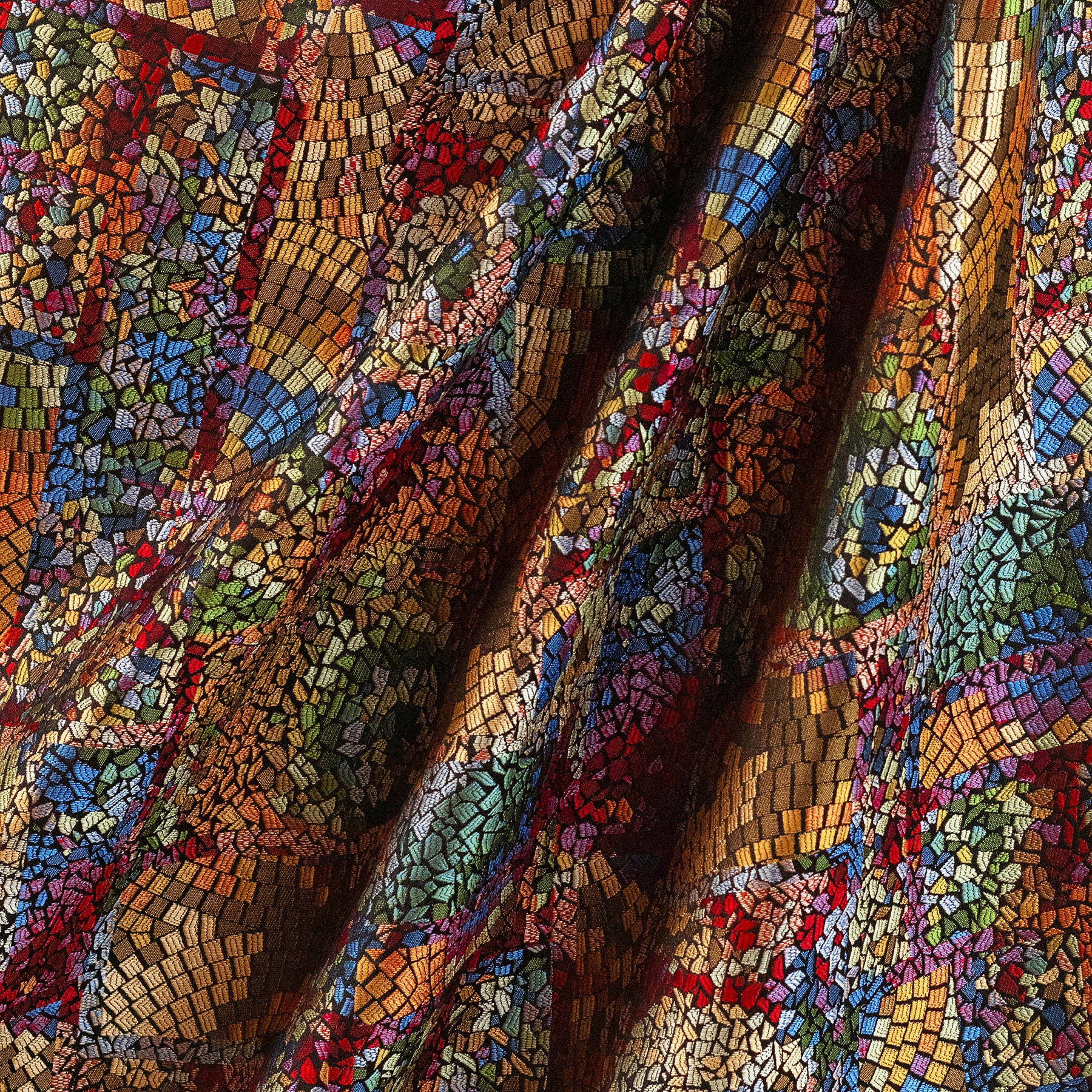 Iris Prism is a beautiful multicoloured woven jacquard fabric with an appearance that can be likened by the art of mosaics and stained glass, giving a sense of elegance and beauty. The bright multitude of colours makes this fabric a statement piece you will have to have in your home. Perfect for everyday use upholstery and cushions, but also great for heavy statement curtains, and coordinate brilliantly with some of our plain velvets and linens!