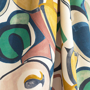 Juniper is a super fun, abstract painting style printed fabric. Featuring modern colours of pinks, greens, mustards and blue on a white cotton base cloth - it is the perfect choice for adding a fun pop of colour to your home furnishings.