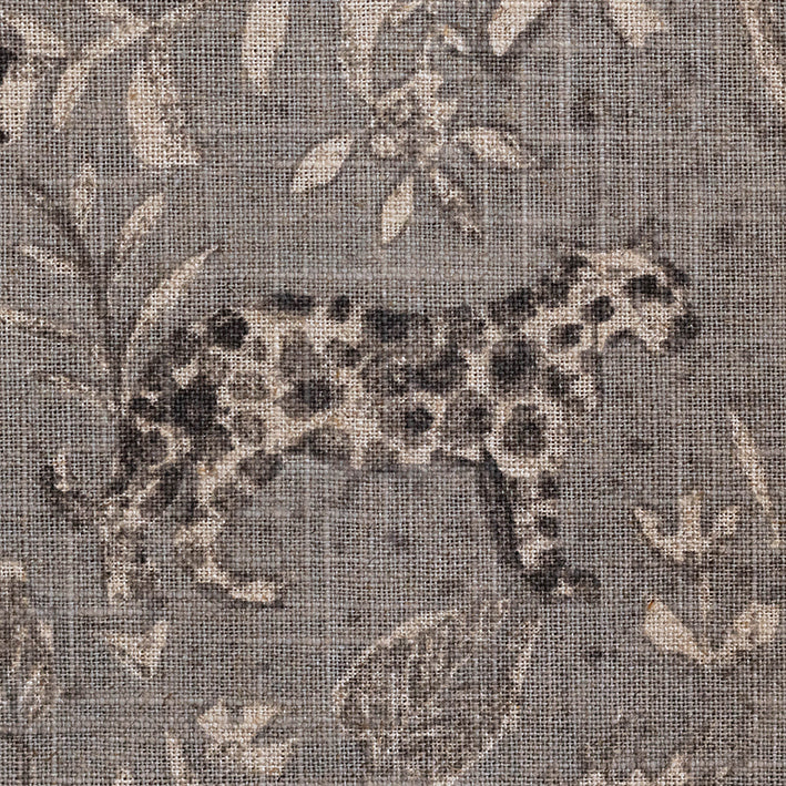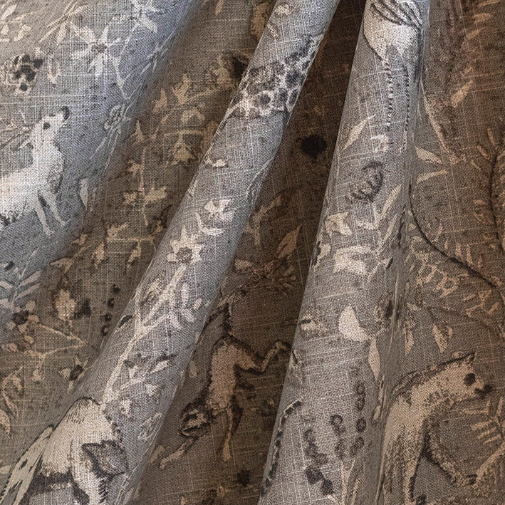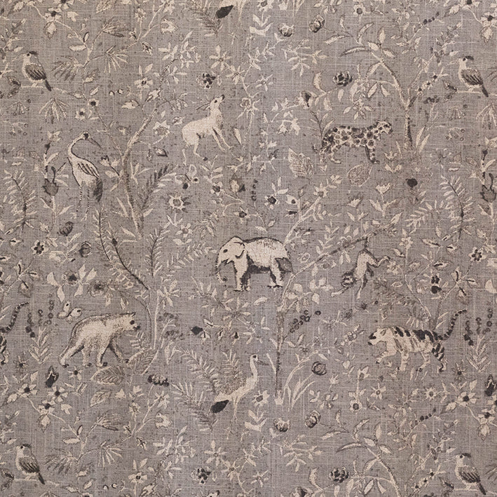 Nilambur Ash is a printed fabric featuring various wild animals, such as elephants, bears, and monkeys, surrounded by flora and fauna. The background is dark grey with slight blue tones. This fabric is suitable for curtaining, blinds, cushions, and occasional upholstery.