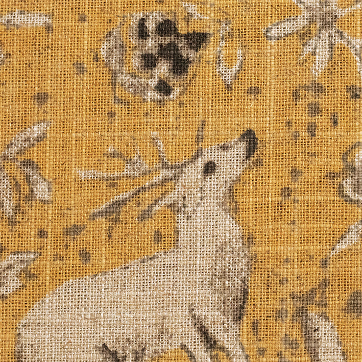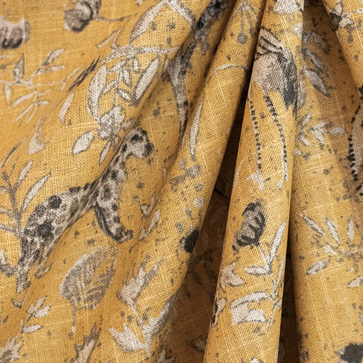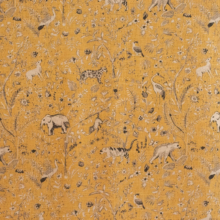 Nilambur Mustard is a printed fabric featuring various wild animals, such as elephants, bears, and monkeys, surrounded by flora and fauna. The background is a rich mustard yellow colour. This fabric is suitable for curtaining, blinds, cushions, and occasional upholstery.