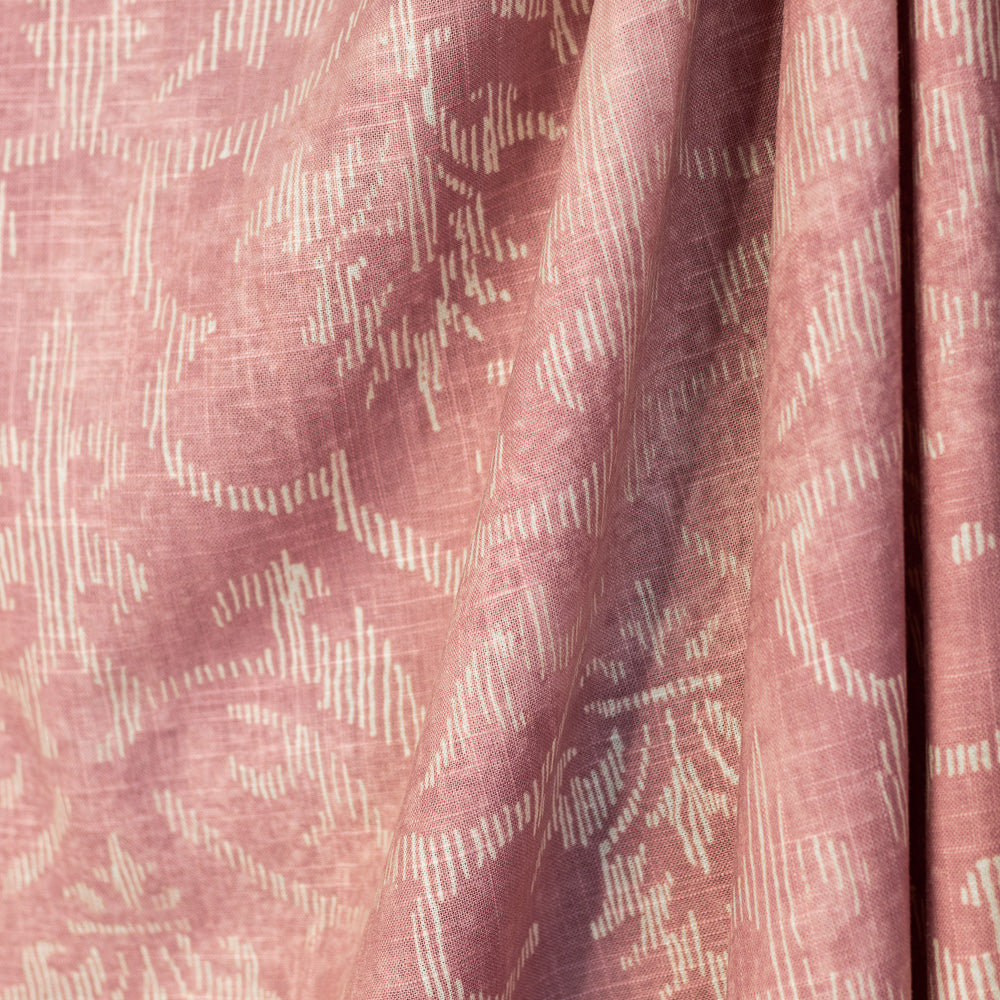 The Penelope print is a traditional pattern with simple vertical lines forming the shapes. Penelope Pink is a soft purple/pink background with the print contrasting in white. This fabric would be suitable for curtaining, blinds, cushions, and occasional upholstery.