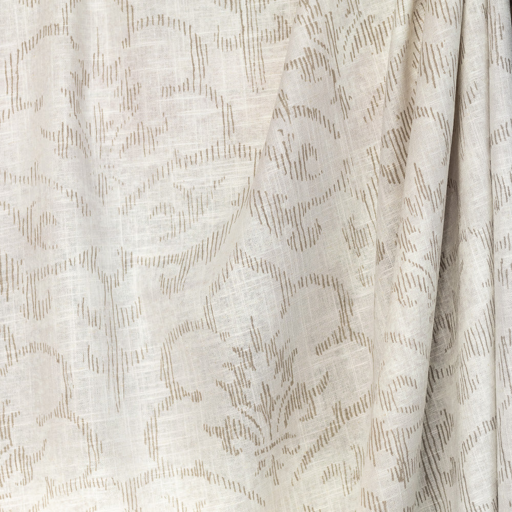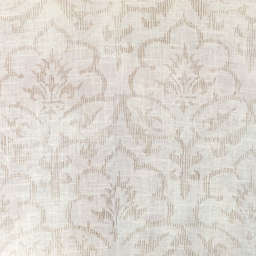 The Penelope print is a traditional pattern with simple vertical lines forming the shapes. Penelope White is a washed cream background with the print contrasting in a natural taupe. This fabric would be suitable for curtaining, blinds, cushions, and occasional upholstery.