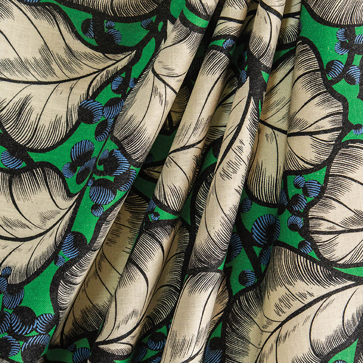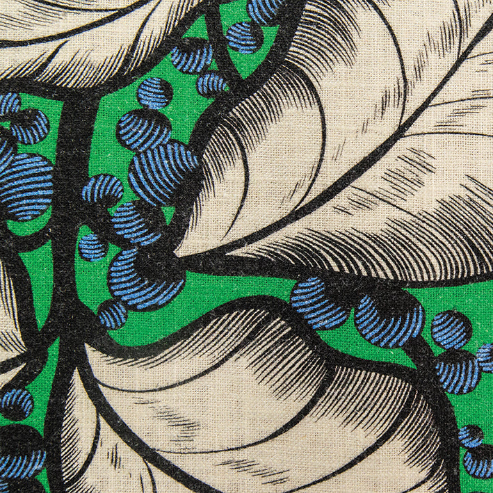 Pepper Tree is a bold and stunning printed fabric with off-white leaves and royal blue floral accents against a rich emerald green background. The foreground print is complete with a thick black outline that is a statement but also pleasing to the eye as it breaks up details. This fabric would be stunning as statement curtaining, cushions, and occasional upholstery to bring a pop of colour to any decor.