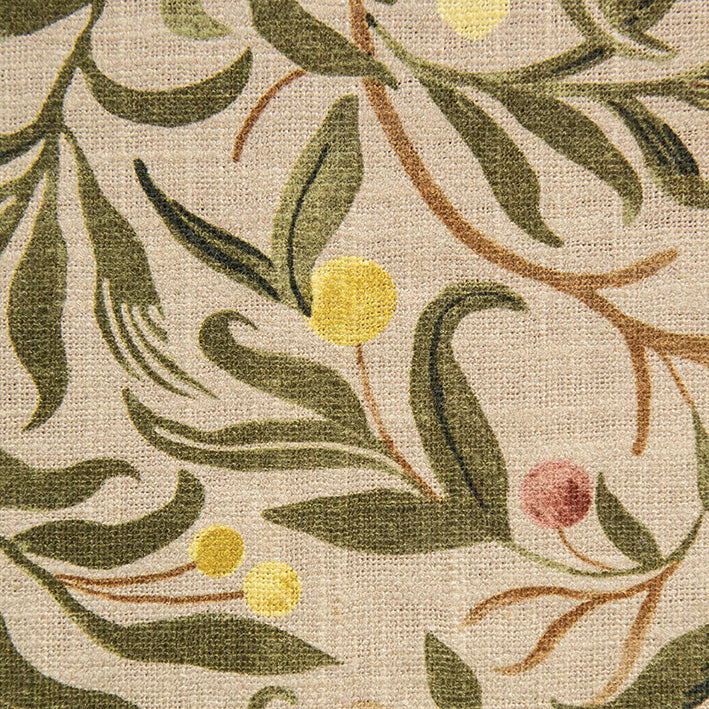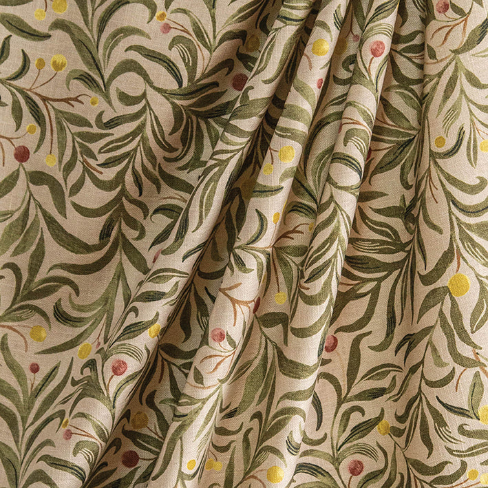 A beautiful William Morris-inspired botanical print, in modern olive with pops of red and yellow. This print pairs wonderfully with our Belgian Freemans and Tarantino linen ranges, and is perfect for curtaining, blinds, cushions, occasional upholstery, and lampshades.