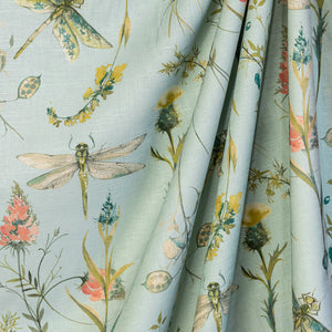 Water Nymph is a lovely botanical and floral printed fabric. The duck egg background provides a subtle colour and acts as a static pond for the green plants, pink and yellow flowers, and dragonflies to flourish in the foreground. The print is calming with subtle colours and an aquatic vibe. This fabric would be perfect for curtaining, cushions, and occasional upholstery to add subtle colour and interest to any decor.