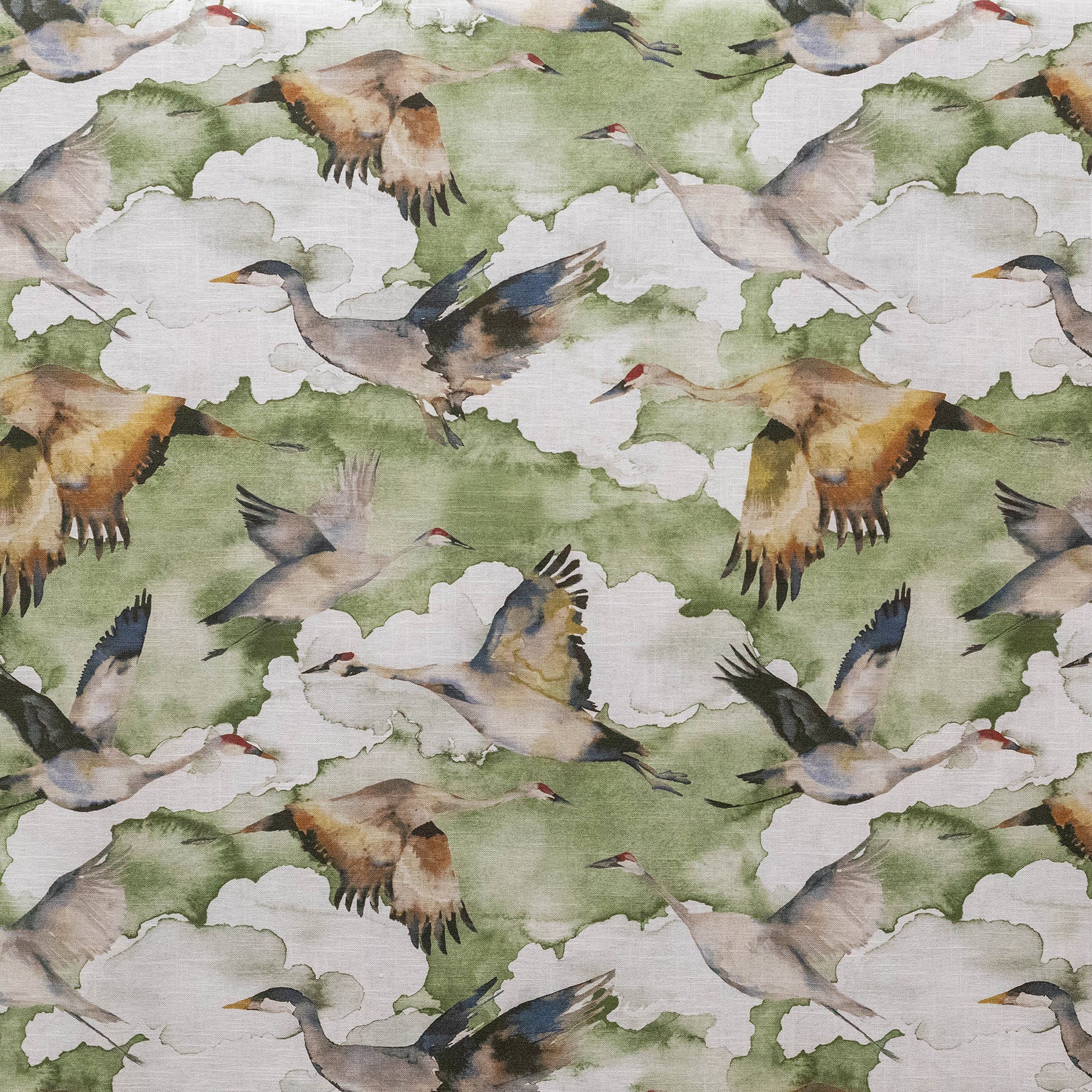 Wingbeat Sage features ink blue and rust orange birds in flight set against a mint/sage background and white clouds. This fabric would be suitable for curtaining, blinds, cushions, and occasional upholstery.