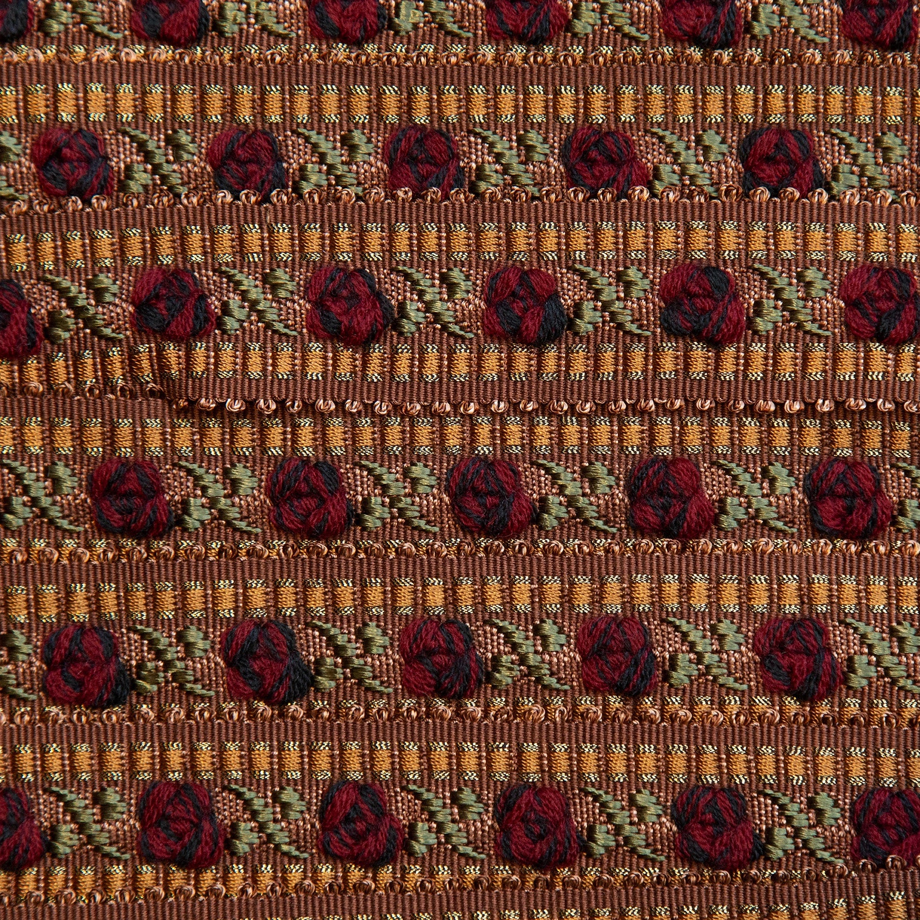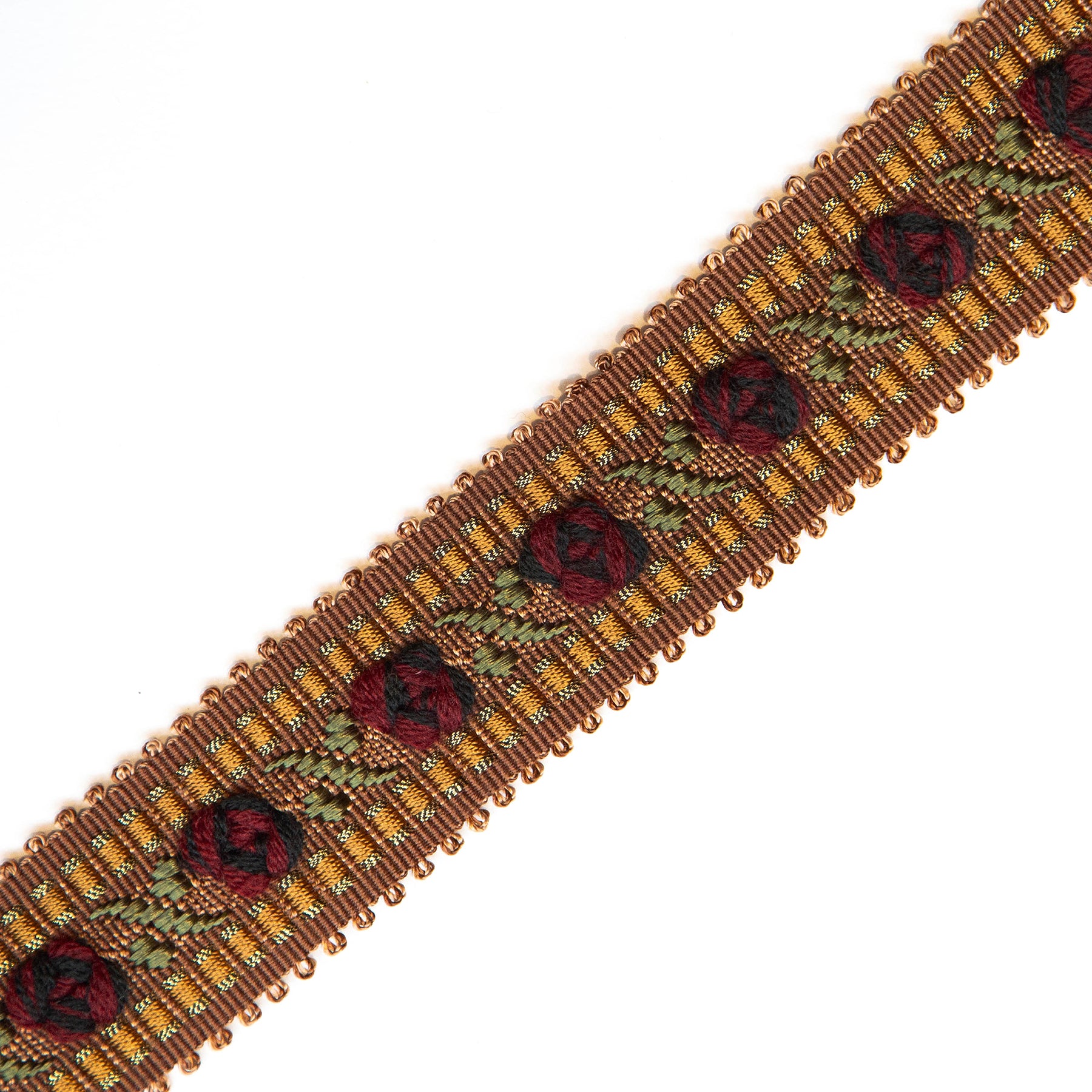 A beautiful braided biscuit brown gimp with dark and shiny gold motifs and black and burgundy roses.