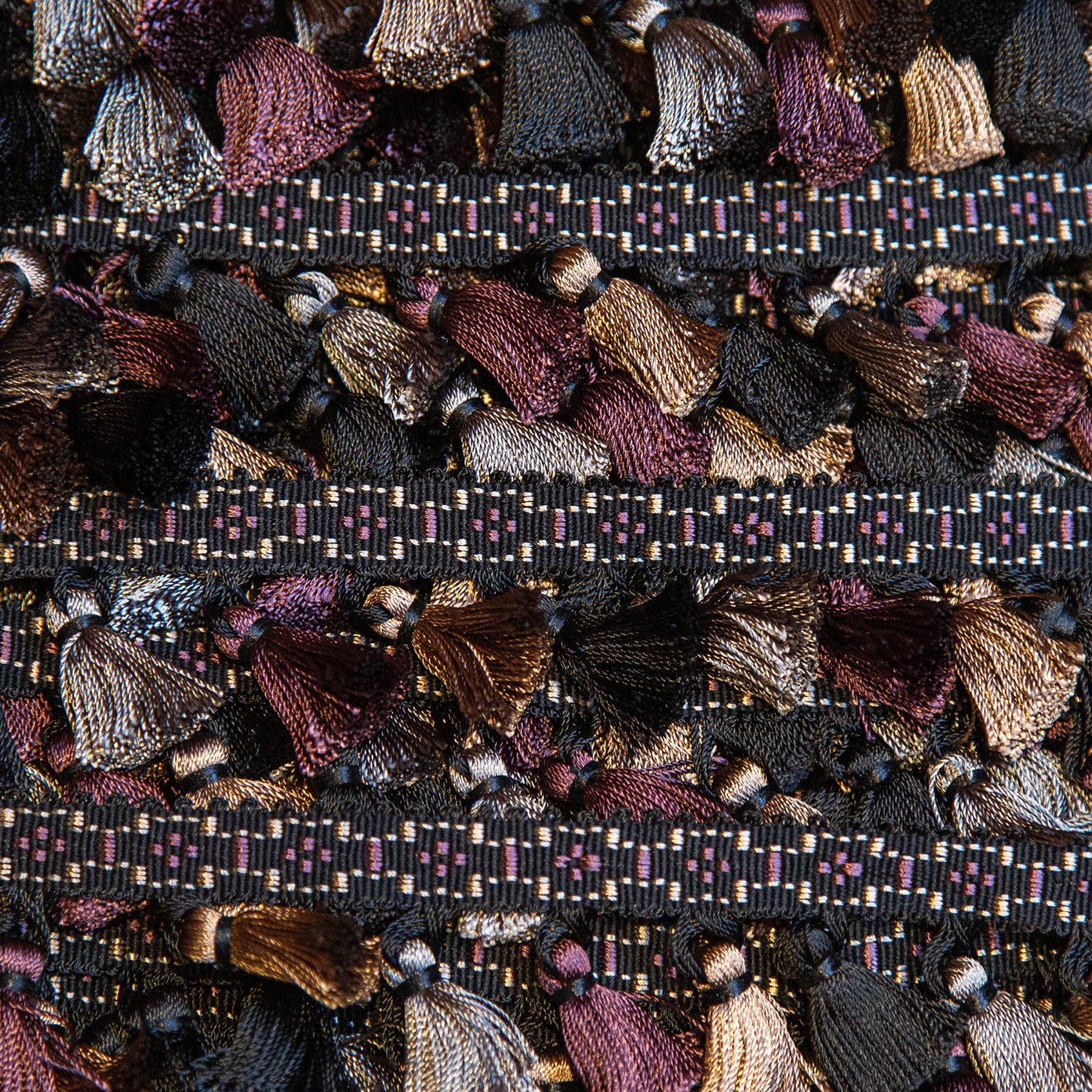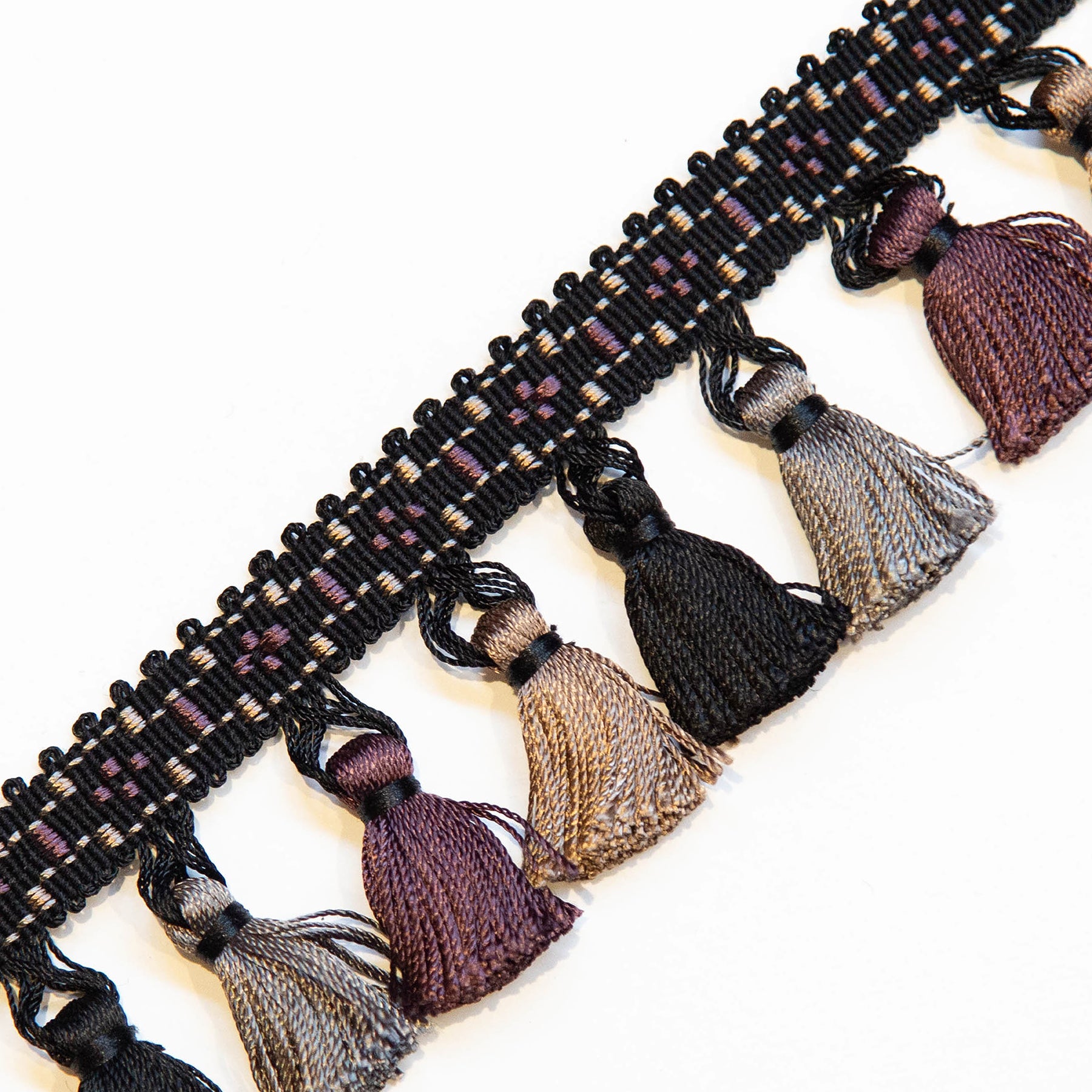 A pretty folk-style braided gimp with pretty tassels in eggplant purple, grey, black and dark taupe.