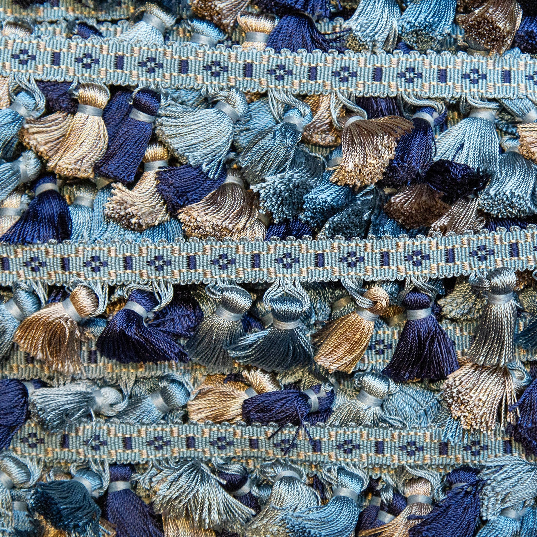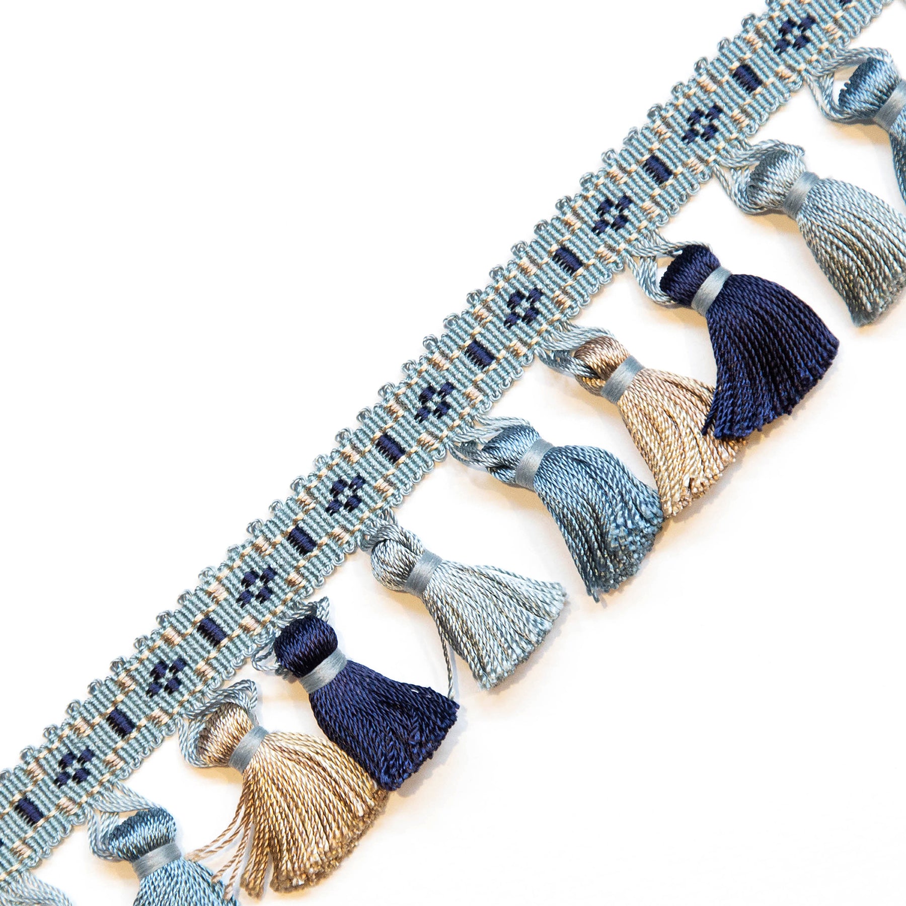 A pretty folk-style braided gimp with pretty tassels in sky blue, navy, pale blue and taupe.