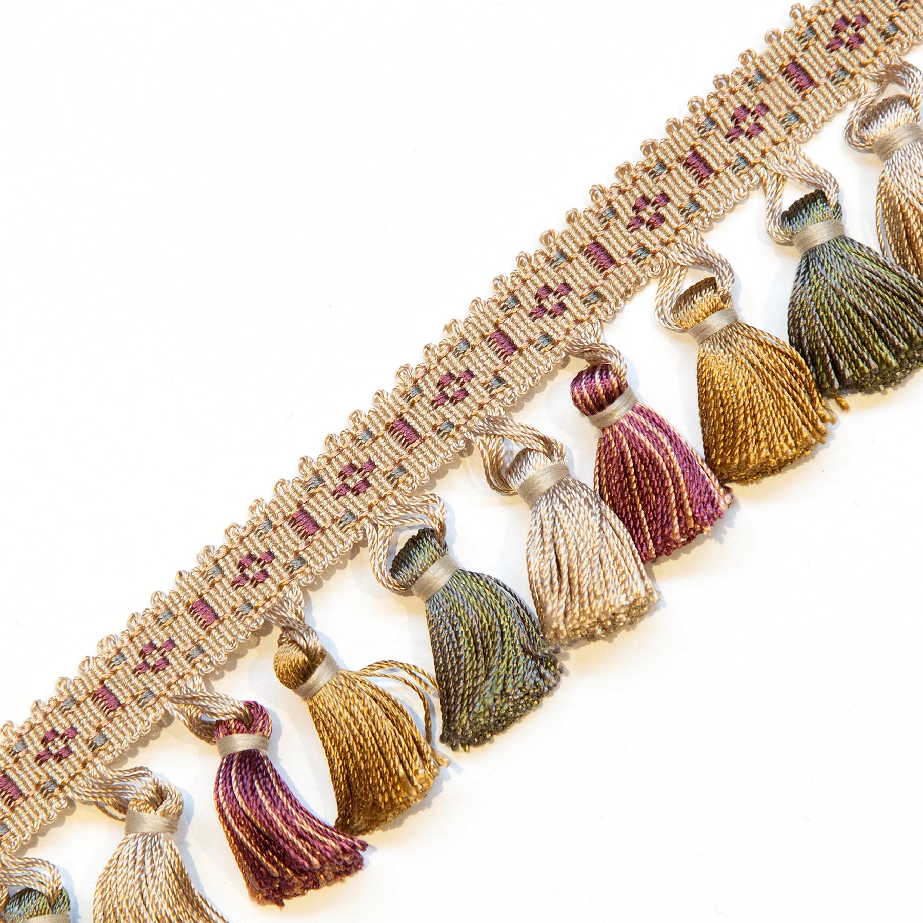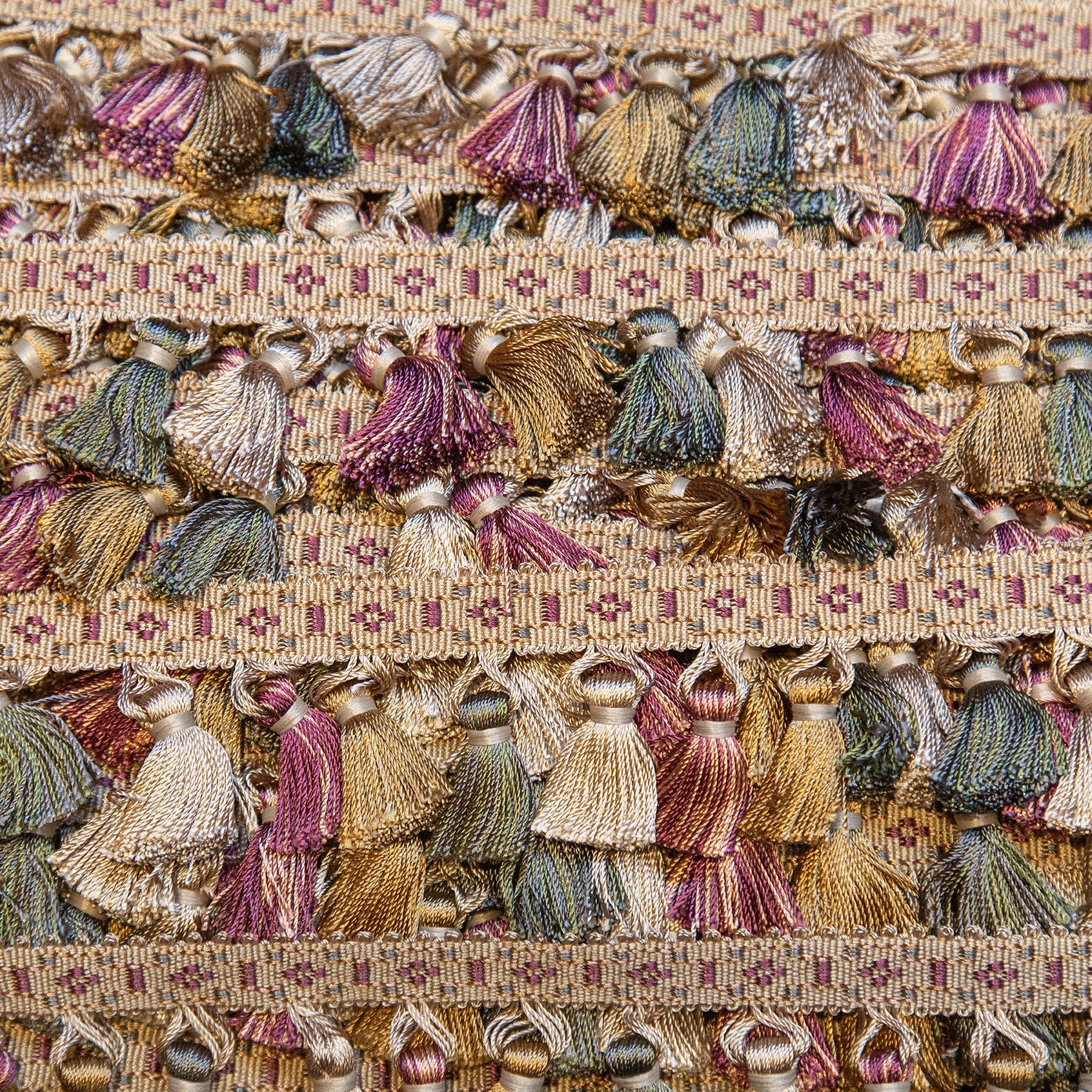 A pretty folk-style braided gimp with pretty tassels in beige, dark gold, violet & pink and faded green & blue.