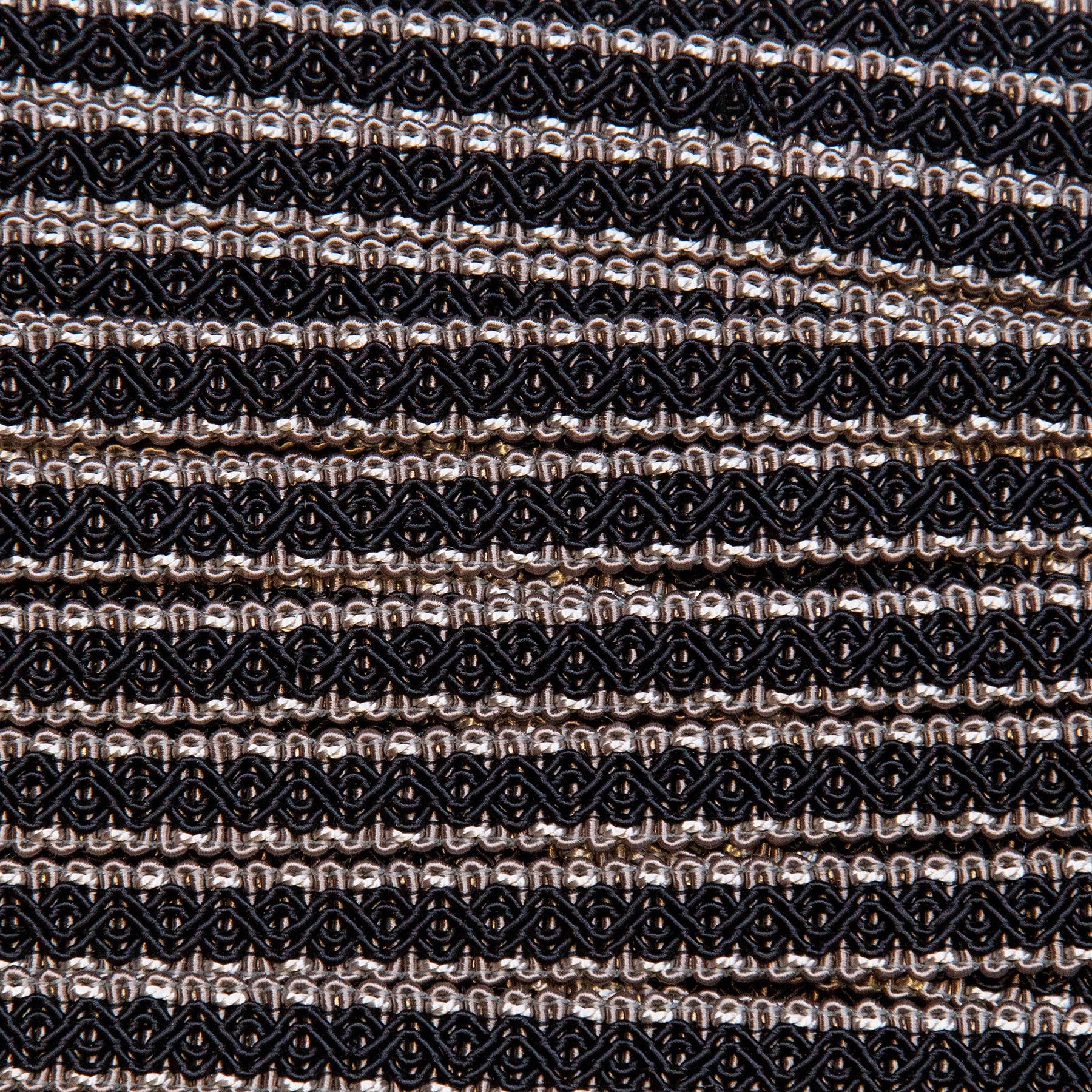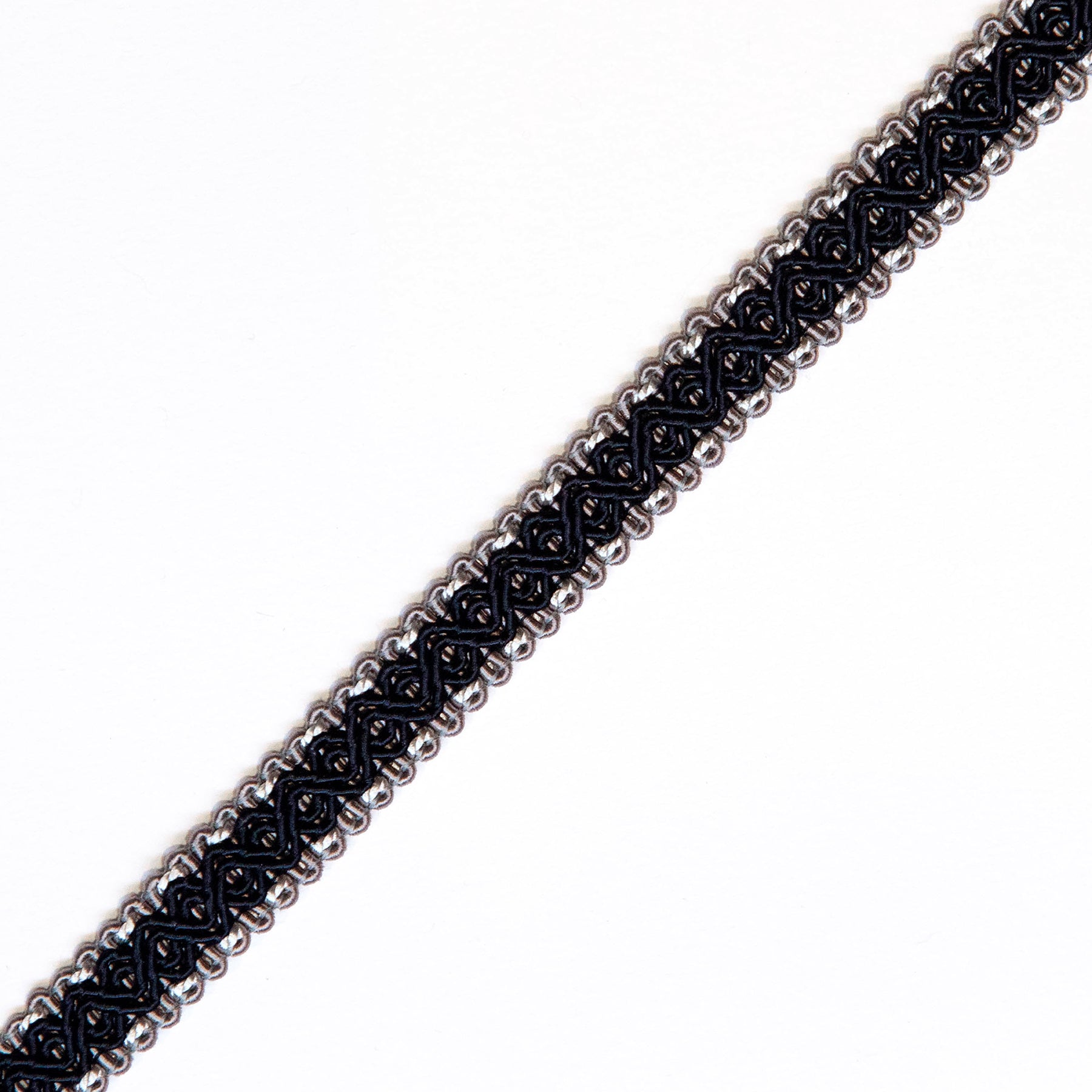 This ornate gimp tape has an intricate pattern in black, white and a taupe/grey.