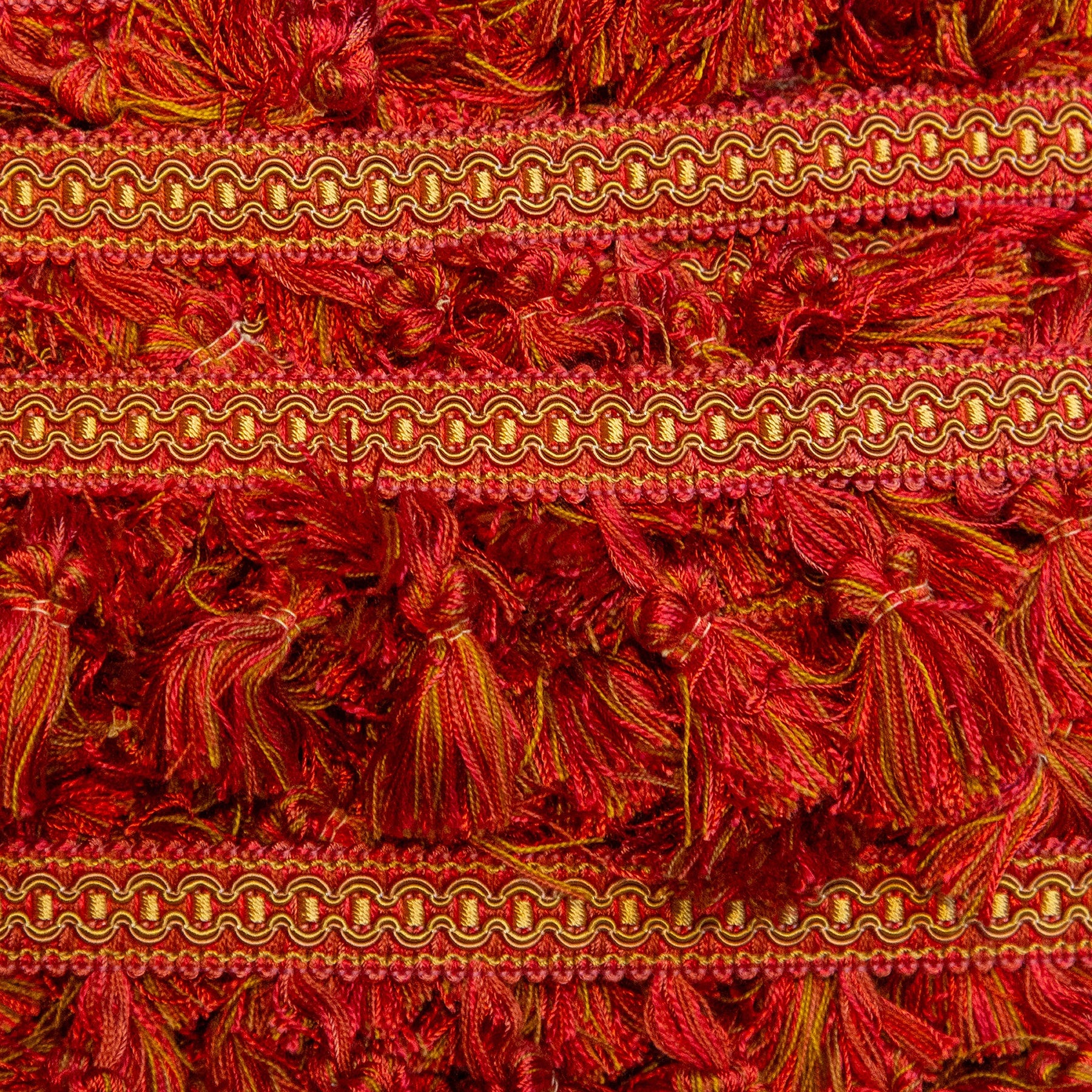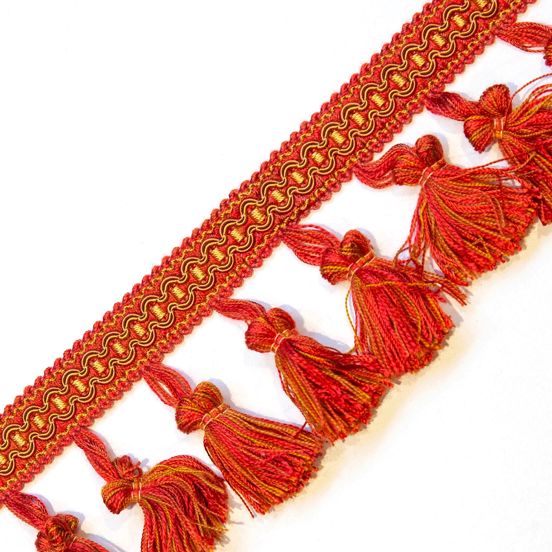 An opulent trim with an intricate band and gorgeous tassels in chilli red, dark orange, copper and deep gold.