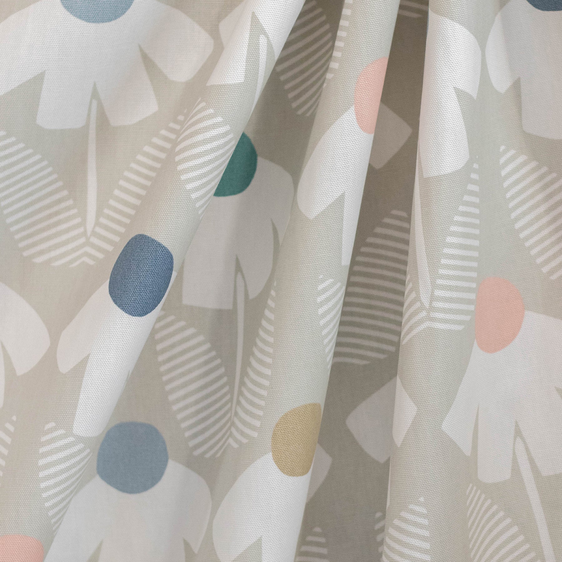 Cute little white daisies with pops of blue, green, mustard and pink over a mushroom grey background. Wonderful for occasional upholstery, curtaining and cushions.