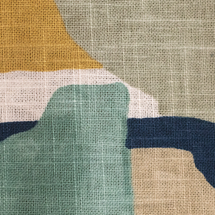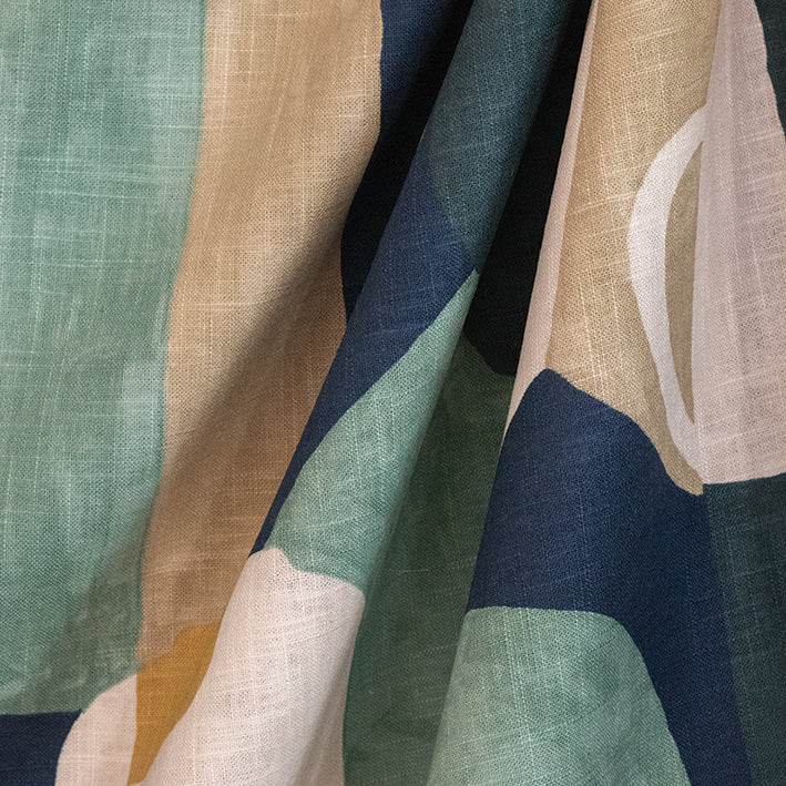 Feel refreshed with this print featuring abstract pots and vases with blues, greens, and mustards overlapping one another. This fabric can be used for cushions, curtaining and occasional upholstery.