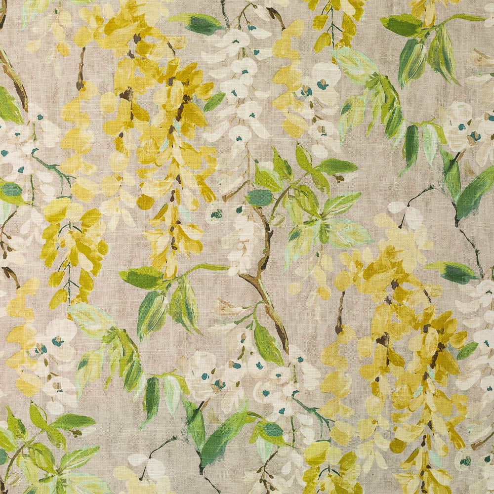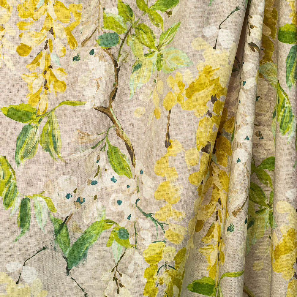 Kowhai Blossom is a lovely painterly style printed fabric featuring yellow flowers and white flowers with green vines set against a cool-toned natural background. This fabric is suitable for curtaining, blinds, cushions, and occasional upholstery.