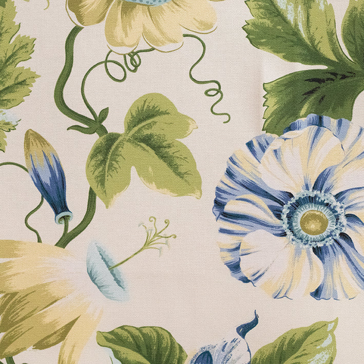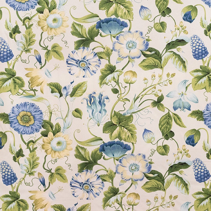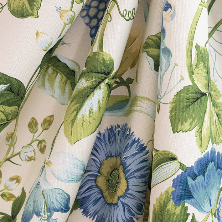 This botanical beauty comes alive with an array of bright blue florals and fresh greens making any space instantly transformed. This print can be used for cushions, curtaining and occasional upholstery.
