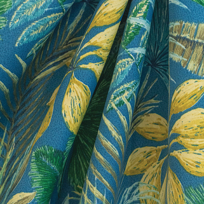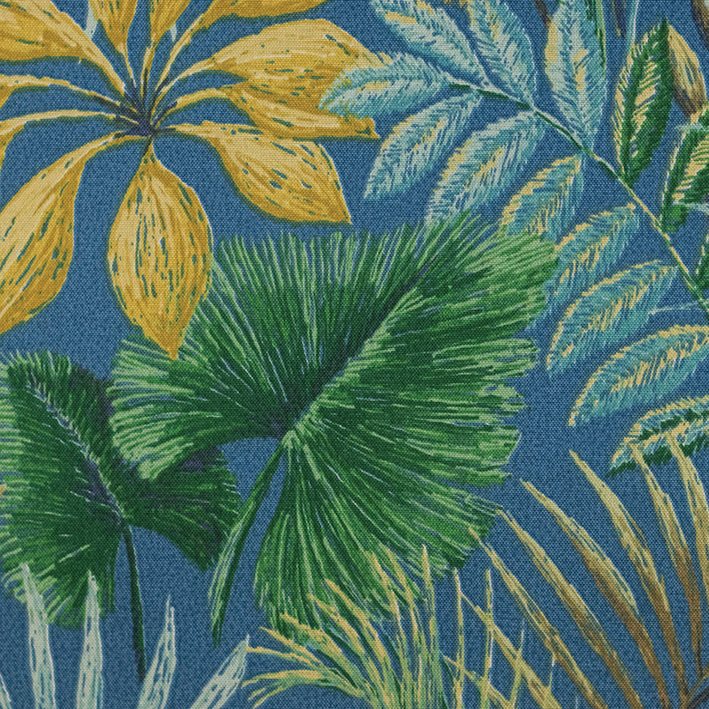 Export yourself somewhere tranquil and tropical with this stunning outdoor print. Ochre, green and baby blue leaves overlap a mid-blue background. Fantastic for curtains, outdoor cushions and soft furnishings.