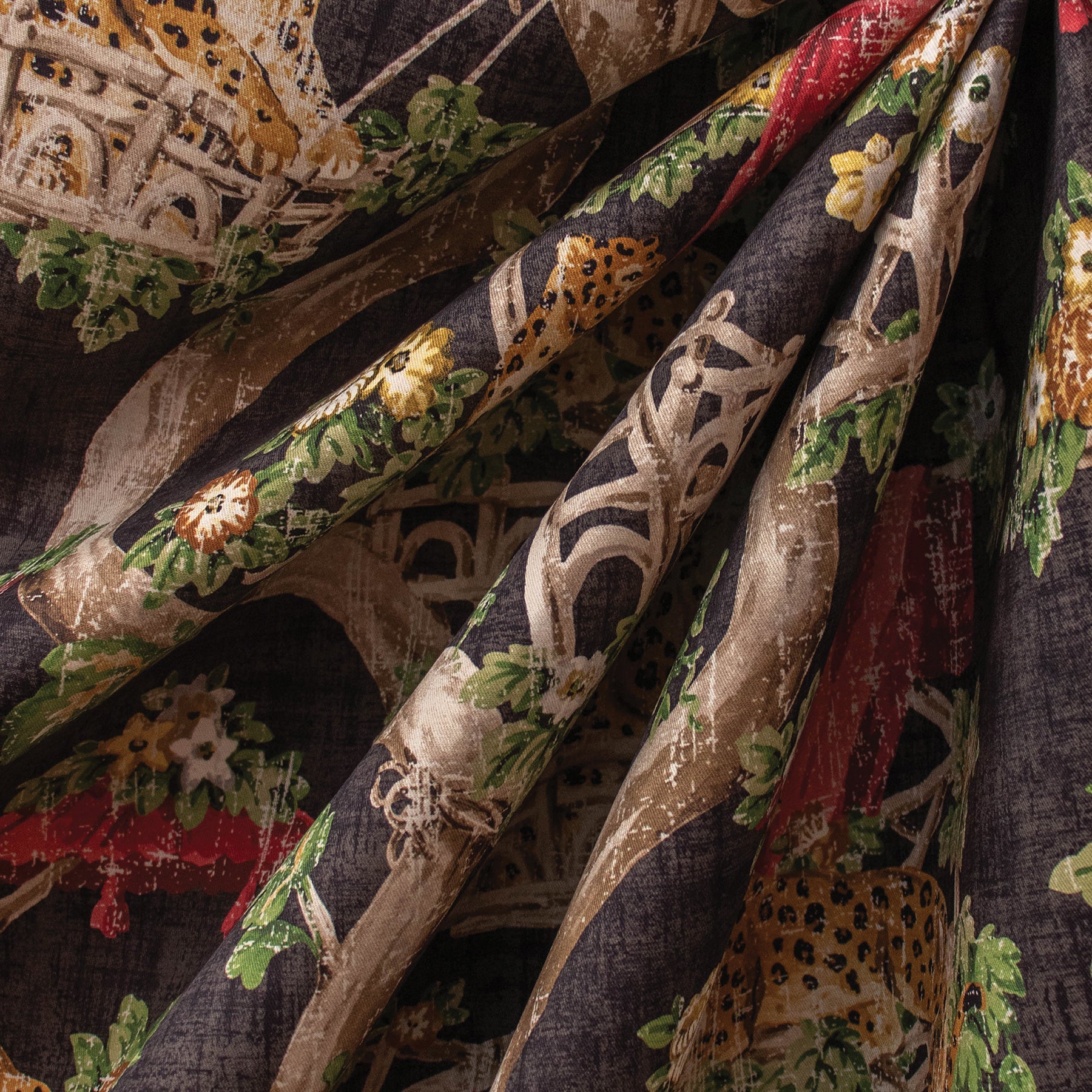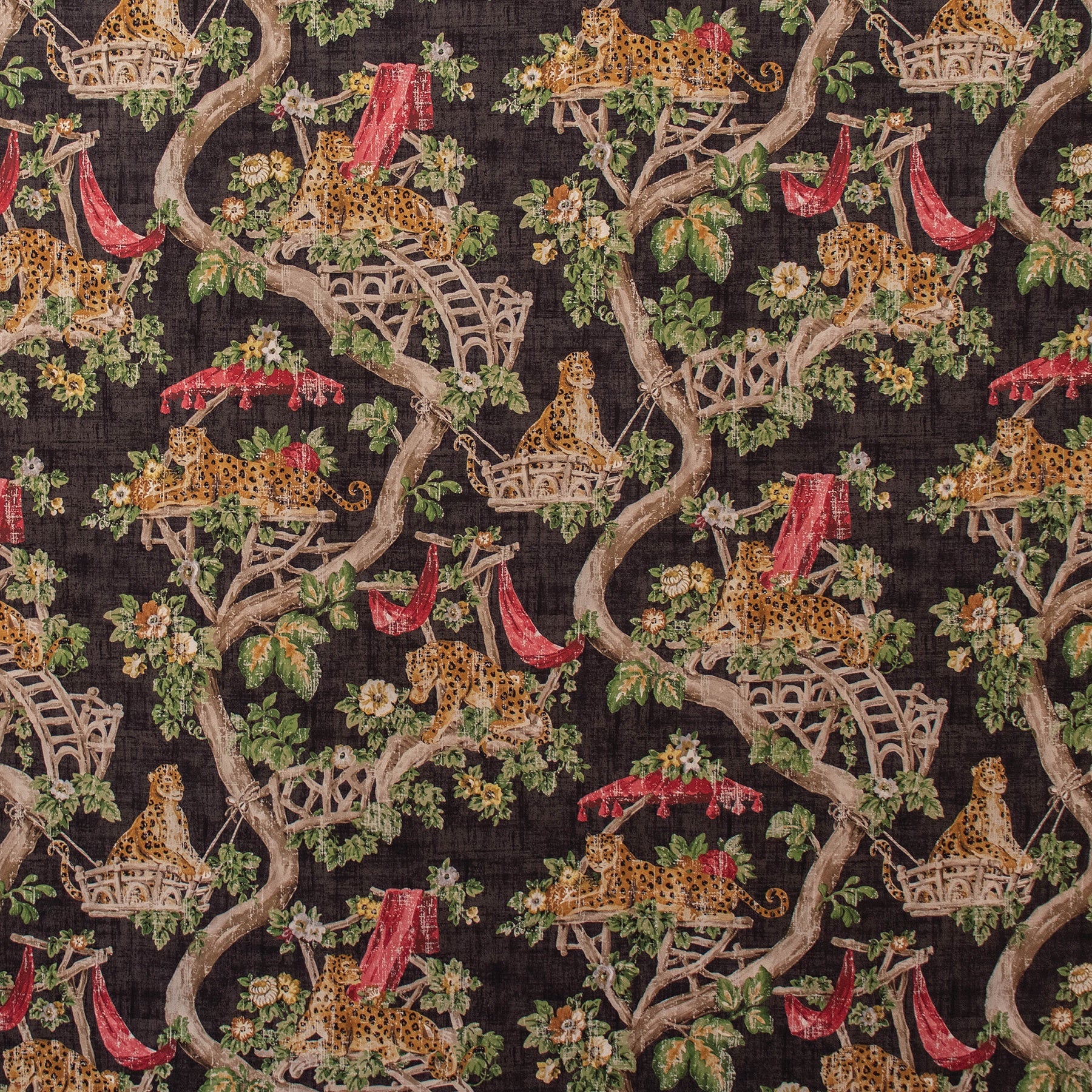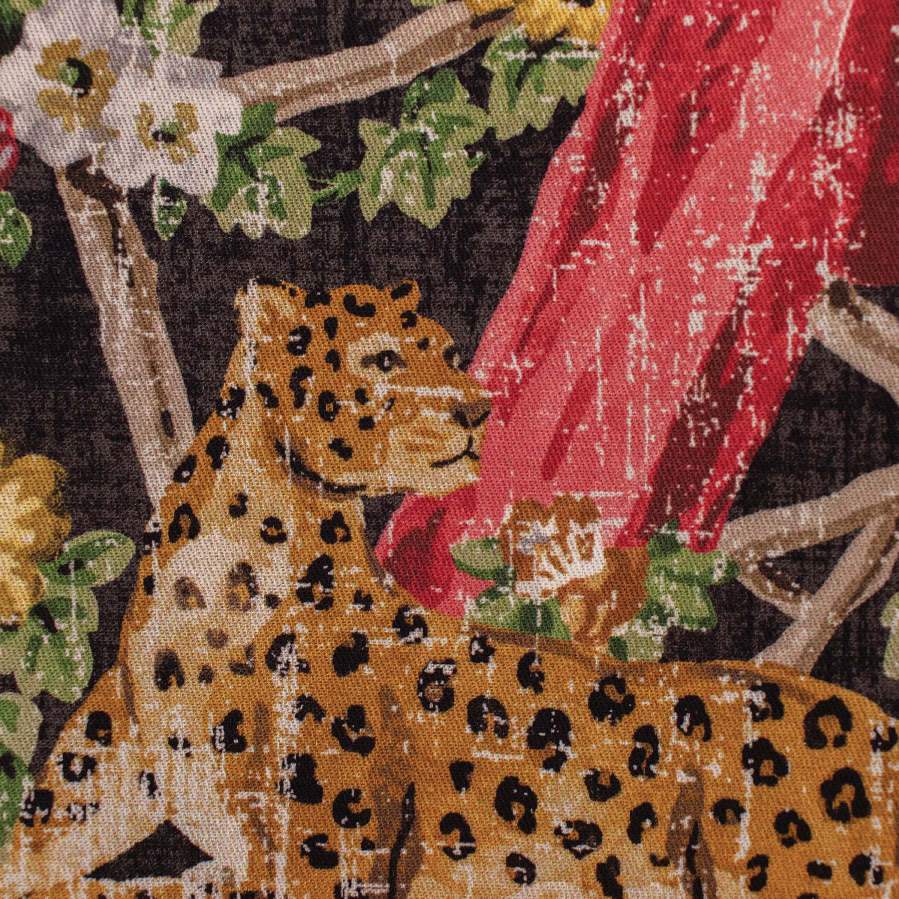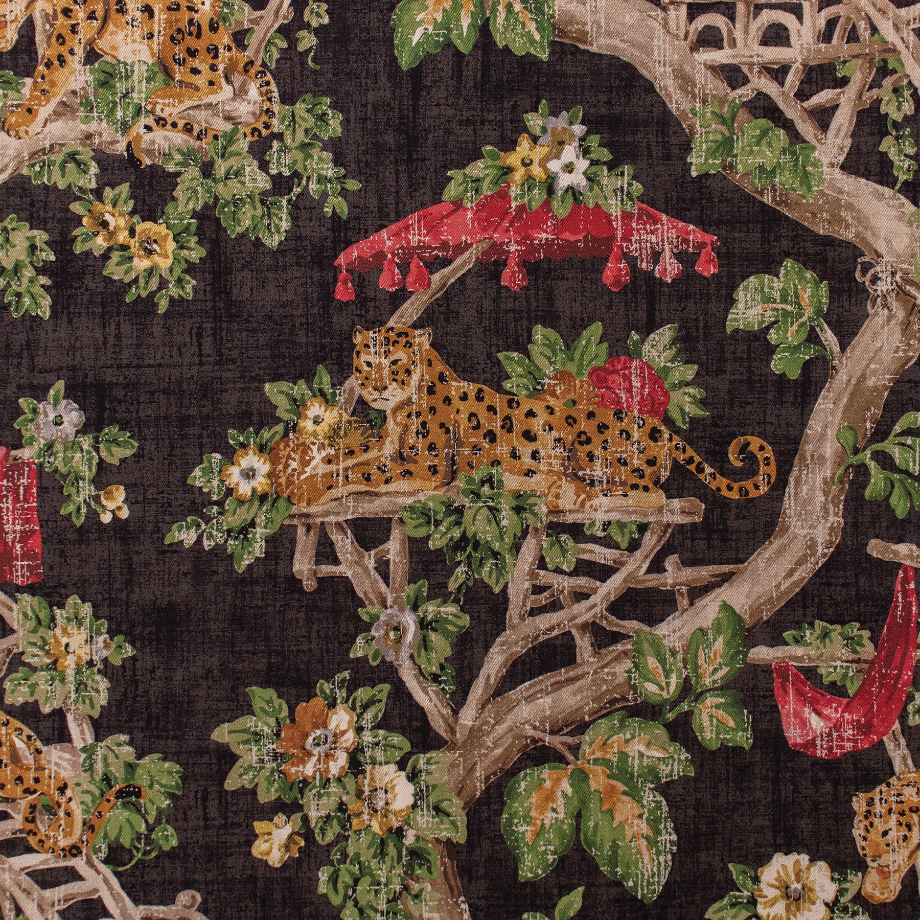 Riparian Retreat brings a sense of faded grandeur and quiet drama to interiors. Featuring illustrated leopards lounging and prowling among florals, foliage, and architectural platforms, the scene unfolds around a tree in a relaxed yet captivating composition. Sable showcases the design on a rich charcoal background. The contrast brings depth and intensity to the leopards and botanical details. A washed, timeworn finish with soft white scratch detailing gives the fabric a gently weathered look, adding depth and character to the print. Made from 100% cotton, Riparian Retreat is suitable for occasional upholstery, cushions, and statement soft furnishings. This fabric is ideal for spaces that embrace personality, texture, and artistic expression.
