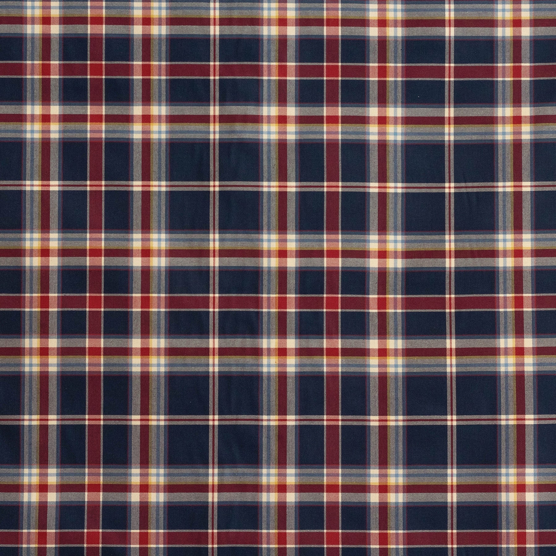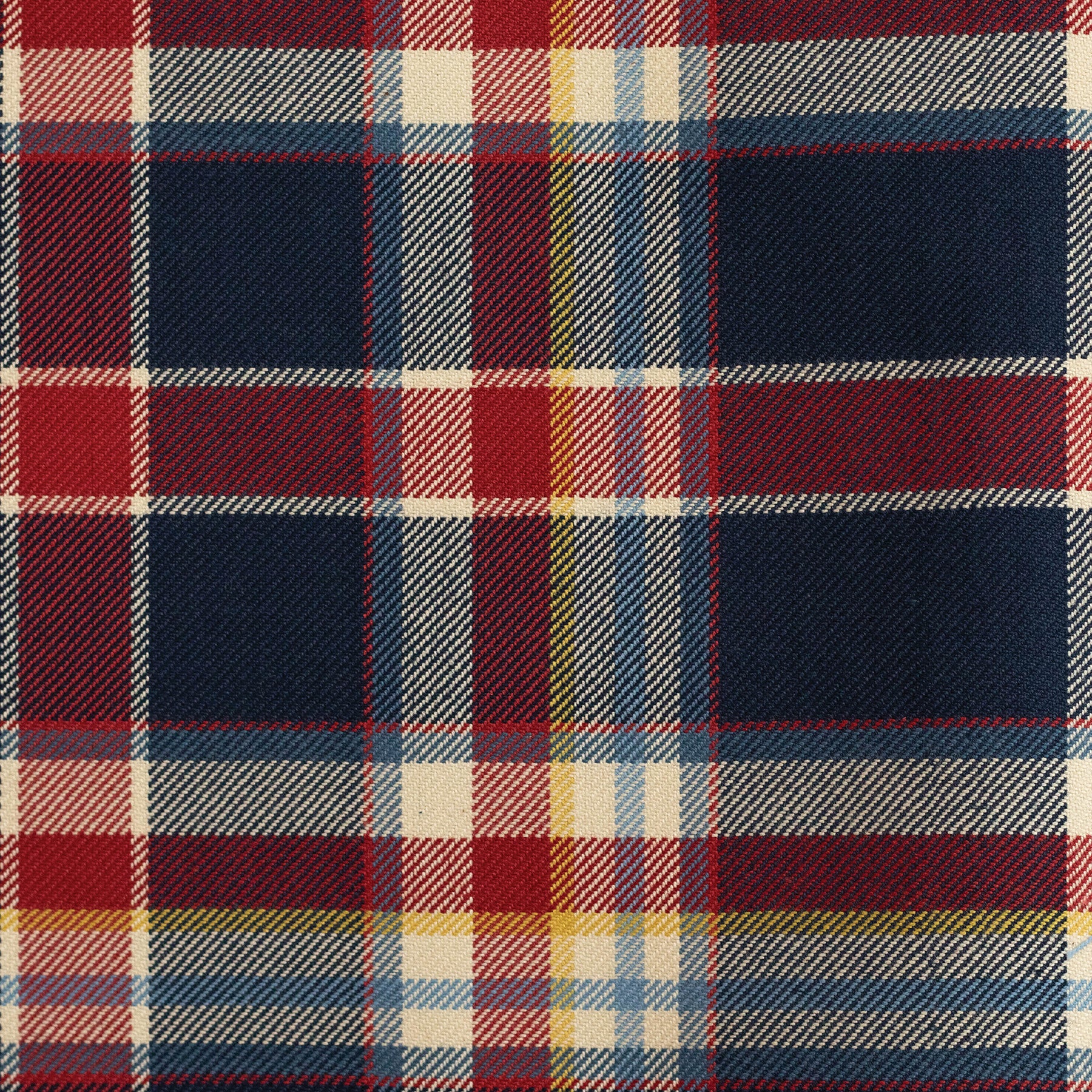Toot toot, all aboard, we're going on an adventure with this fabric! Cute stripes of sky blue, buttercup yellow, strawberry red and navy overlap an off-white background with this playful tartan. A wonderful choice for everyday and occasional upholstery, cushions and curtaining.