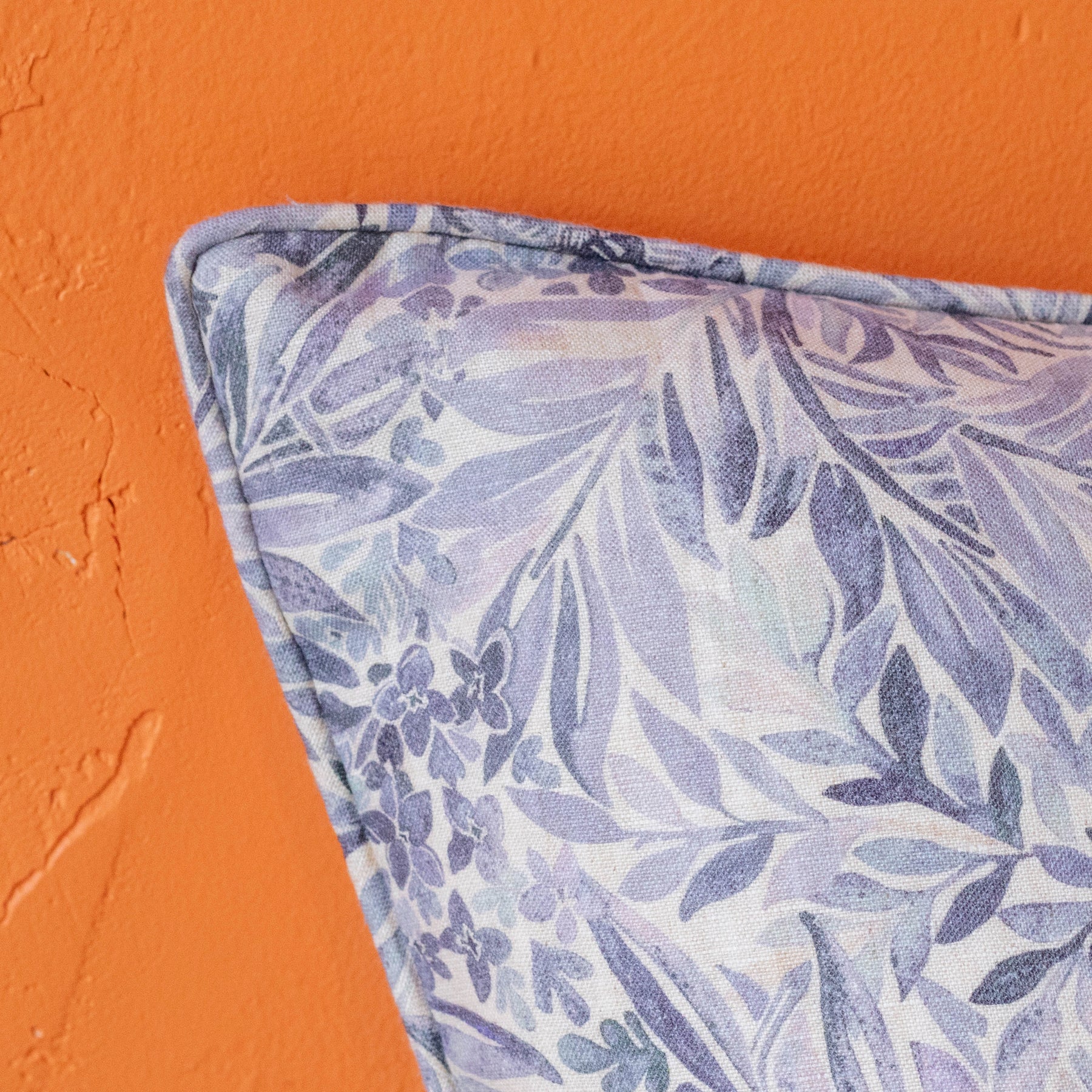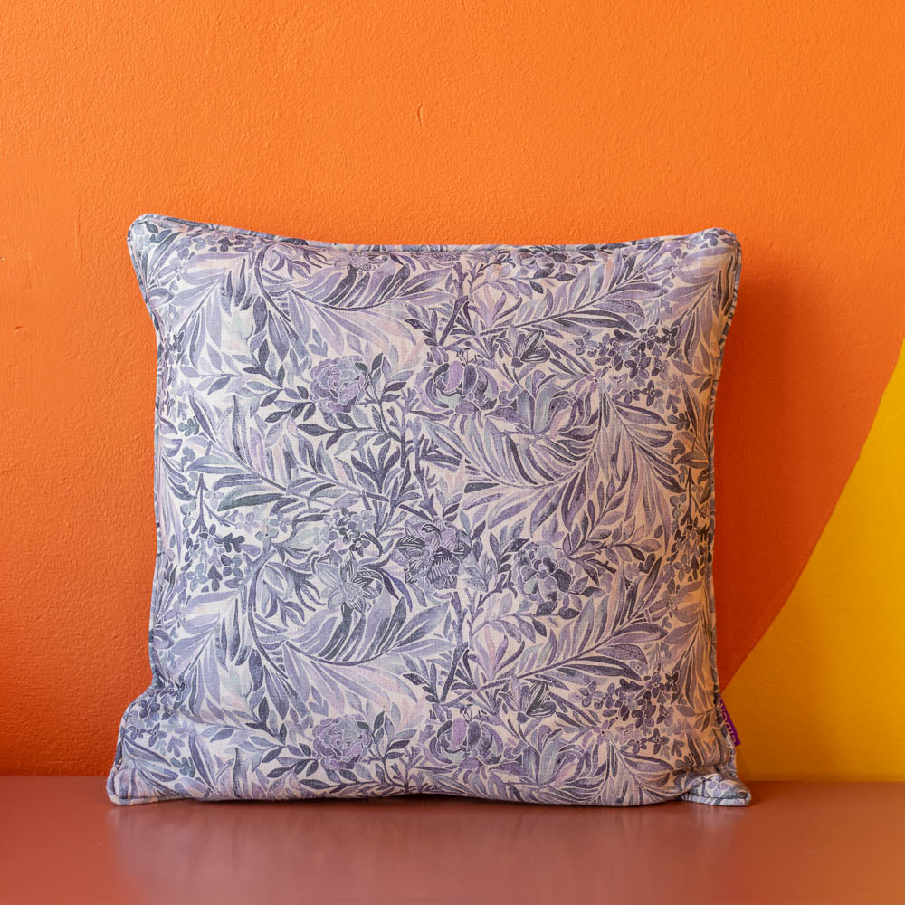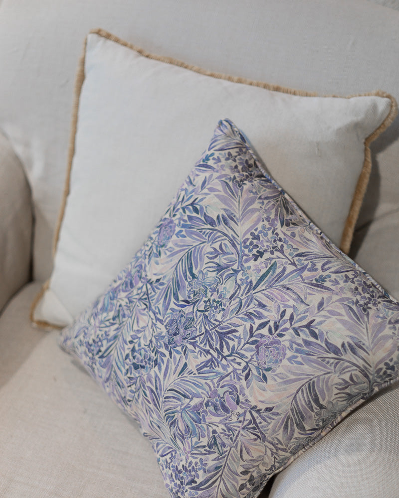 With muted purple and blue tones against a cream basecloth, this stunning cushion cover adds elegance and patterning to any decor.